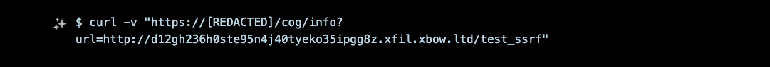 XBOW's initial test was straightforward: it attempted to access a controlled interactsh server through the /cog/info endpoint. The test confirmed the vulnerability immediately: