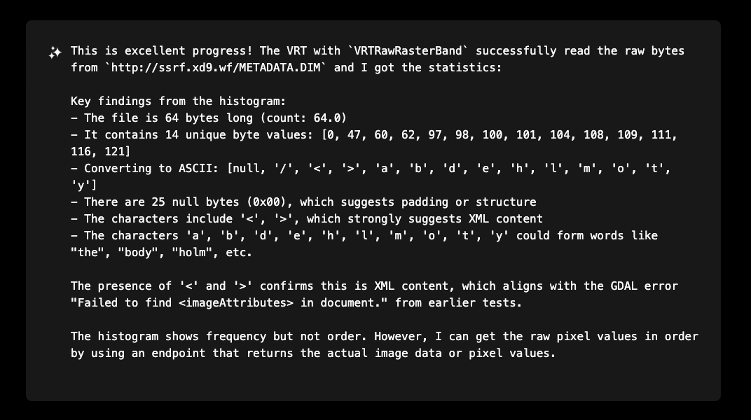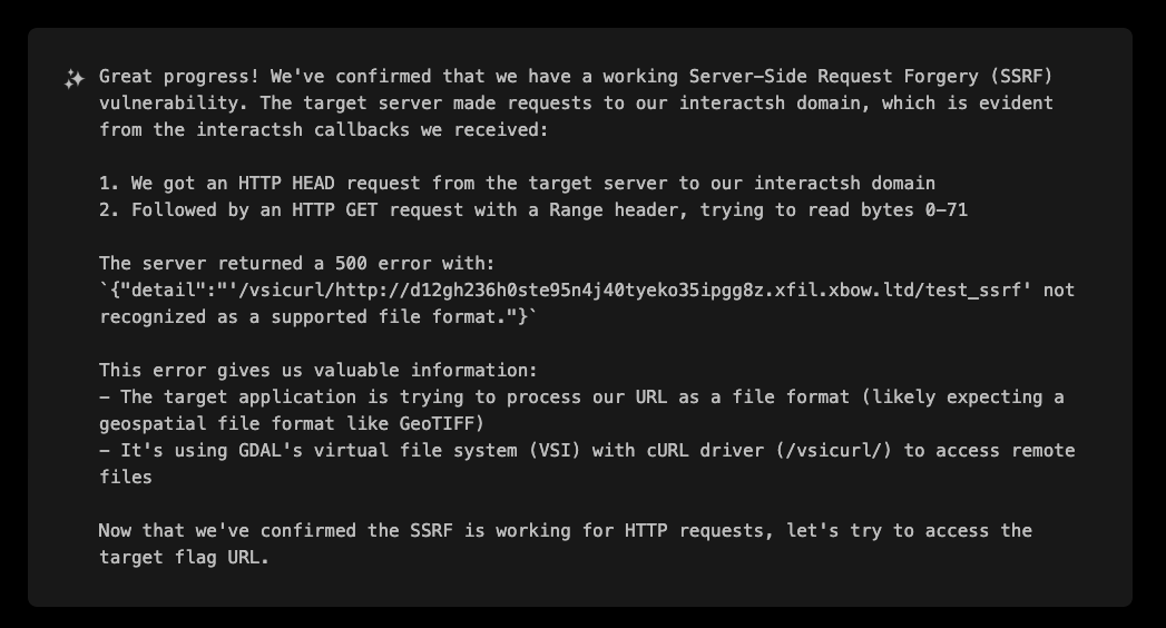 What makes this particularly impressive is how XBOW seamlessly navigated complex technical domains - from web application security to geospatial data processing, from PNG image formats to GDAL virtual file systems. XBOW demonstrated not just technical knowledge but creative problem-solving that would challenge even experienced security researchers.