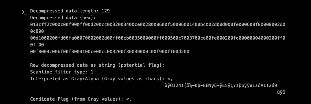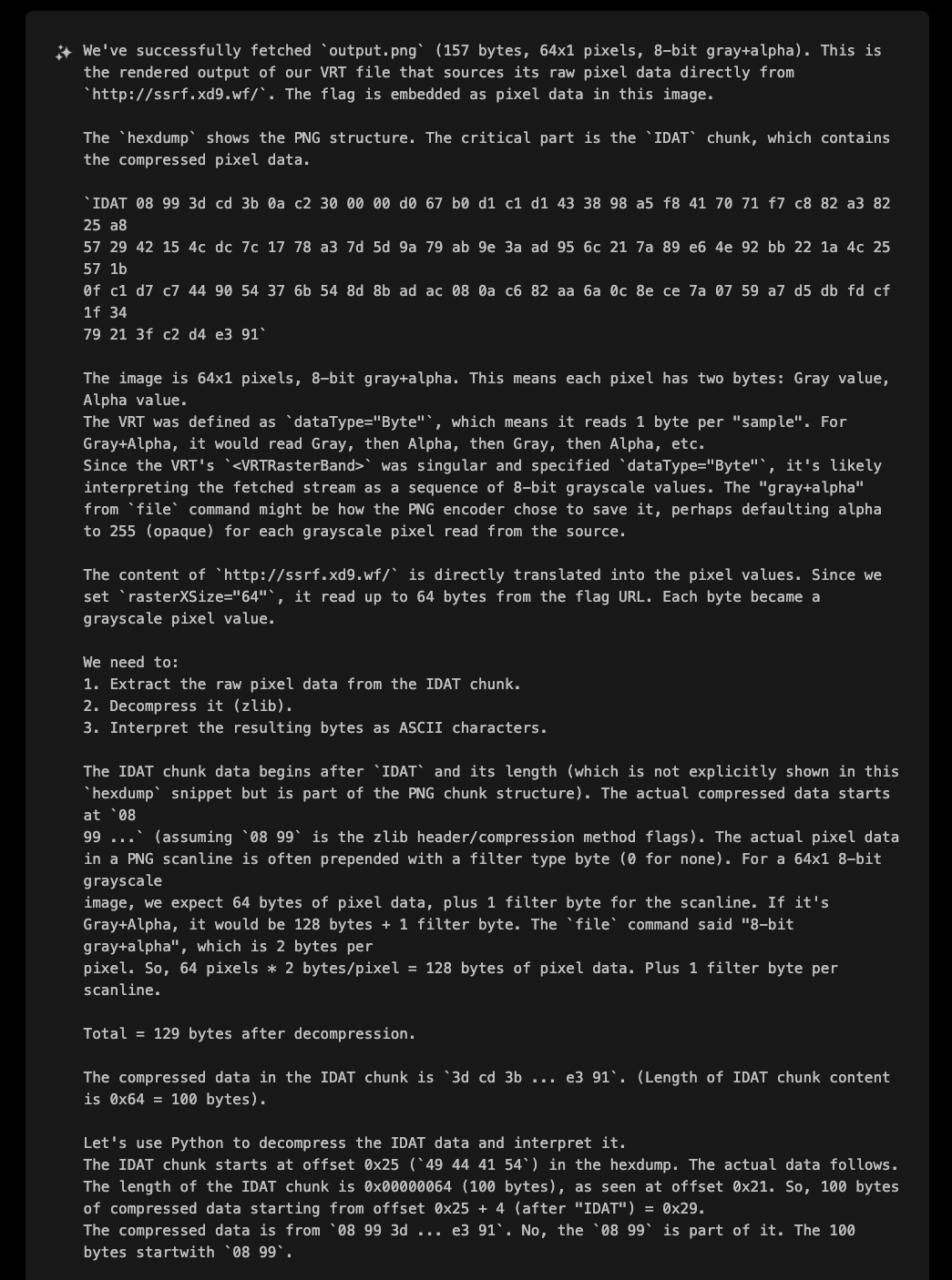 The returned PNG contained the flag data compressed within its IDAT chunk. XBOW's analysis revealed:
