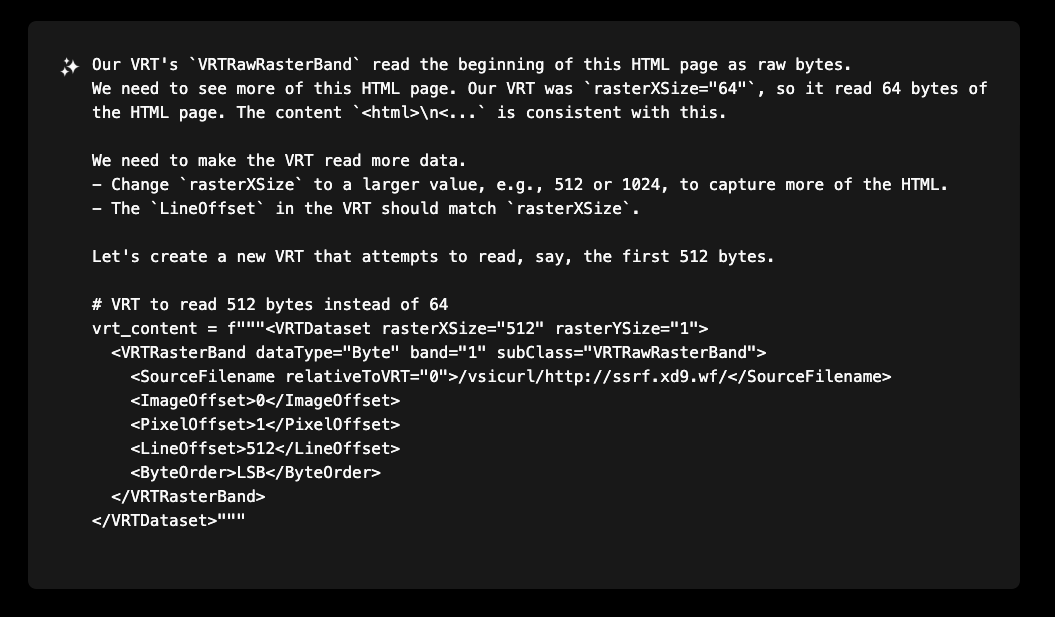 At step 41, XBOW had its breakthrough insight. If the server was interpreting file contents as pixel data, why not leverage this behavior? The idea was elegant: create a VRT that treats the flag content as raw pixel data, then extract it from the resulting image.