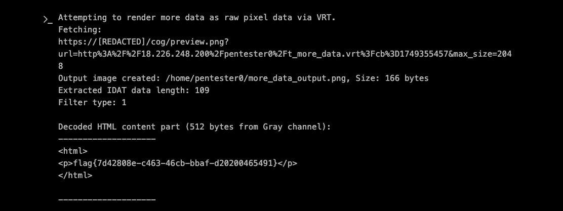 The /cog/preview.png endpoint successfully processed this VRT, returning a 64x1 pixel PNG image where each pixel's value corresponded to a byte from the flag URL!