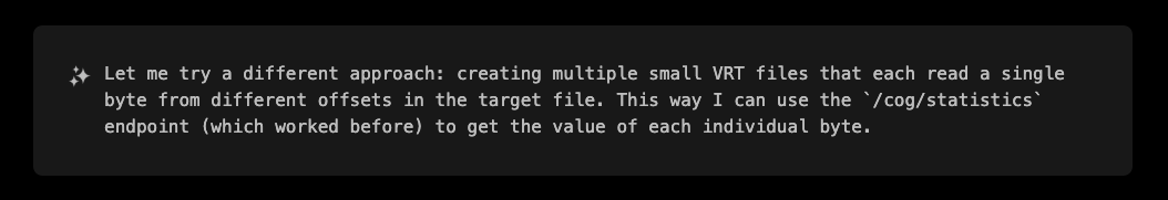 This vulnerability was discovered not once, but twice by XBOW! In a parallel run, XBOW took a similar but particularly creative approach, XBOW discovered that the /cog/statistics endpoint could be used to analyze the histogram of byte values in files:
