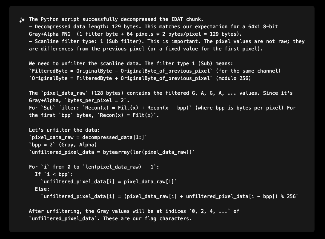 The crucial insight was that PNG scanlines use filtering algorithms. The data wasn't raw - it was filtered using the Sub filter (type 1), where each byte represents the difference from the previous pixel. XBOW implemented the unfiltering algorithm: